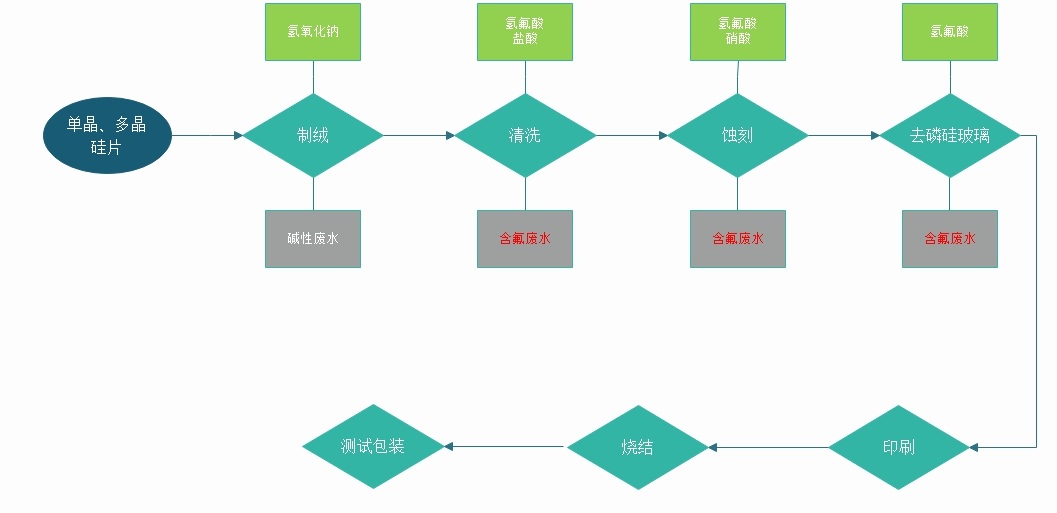 光伏行業(yè)含氟廢水主要來(lái)源于電池車(chē)間,電池車(chē)間的工藝為:制絨,擴(kuò)散,濕法刻蝕,噴涂減反射膜,印刷燒結(jié)。其中硅片制絨和刻蝕兩個(gè)工序產(chǎn)生廢水,包括費(fèi)酸液(硝酸+氫氟酸、氫氟酸+鹽酸或氫氟酸)、廢堿液、酸清洗水、堿清洗水。其中廢酸液和廢堿液水量較小,為間歇排放,酸清洗水和堿清洗水水量較大,水質(zhì)相對(duì)穩(wěn)定。其常見(jiàn)生產(chǎn)工藝為: