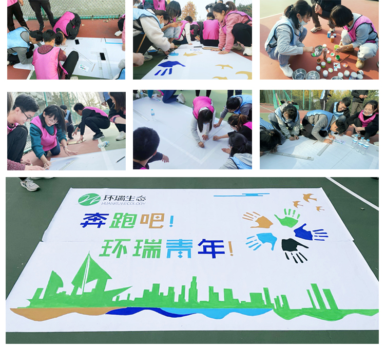 團隊巨畫到底是多大的畫呢?看著地上兩張畫布,拼起來竟然長3米寬1.8米 !這幅畫繪制完成可不是一件簡單的事情,但這難不倒我們環瑞的“小畫師”們。考慮到畫要完美拼接起來,機智的小伙伴們將畫布合二為一,然后進行分工。像對數字比較敏感的理工男們開始拿起尺子和鉛筆比對著尺寸;線條的勾勒和描邊這對平時在實驗室工作的小伙伴們自然是不在話下;色彩搭配,顏色調和這對做設計的小伙伴來說也很得心應手。小伙伴們不僅根據自己的所長積極投入到創作中來,還把工作中認真細致,一絲不茍,精益求精的精神,淋漓盡致發揚到巨畫中來。