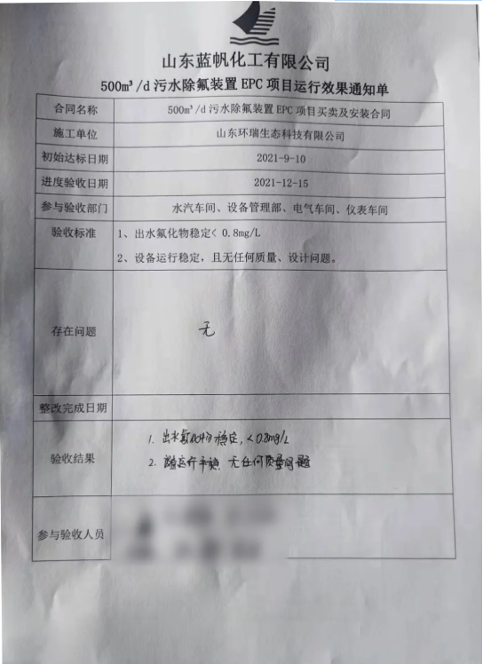 2021年12月15日,我司深度除氟<0.8mg/L項目——《藍帆化工煤造氣廢水深度除氟項目》順利通過竣工驗收!