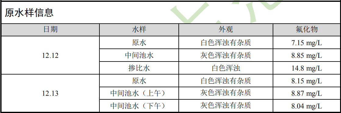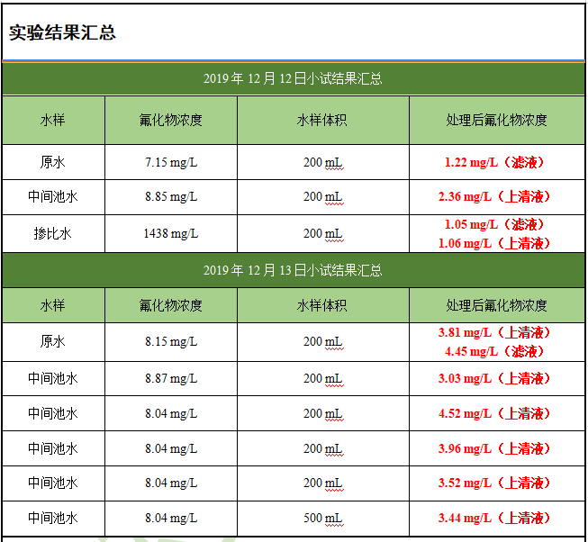 下面是工程水在現(xiàn)場(chǎng)做的除氟劑投加實(shí)驗(yàn)數(shù)據(jù):