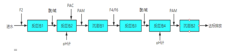 低濃度含氟廢水是指含氟在20mg/L左右,因這部分廢水已無法經鈣鹽處理繼續降低,而通過吸附等方法又無法大規模運行。針對這部分廢水可使用我公司液體除氟劑GMS-F4或固體除氟劑GMS-F6,一步處理,直接達標排放,具體流程如下: