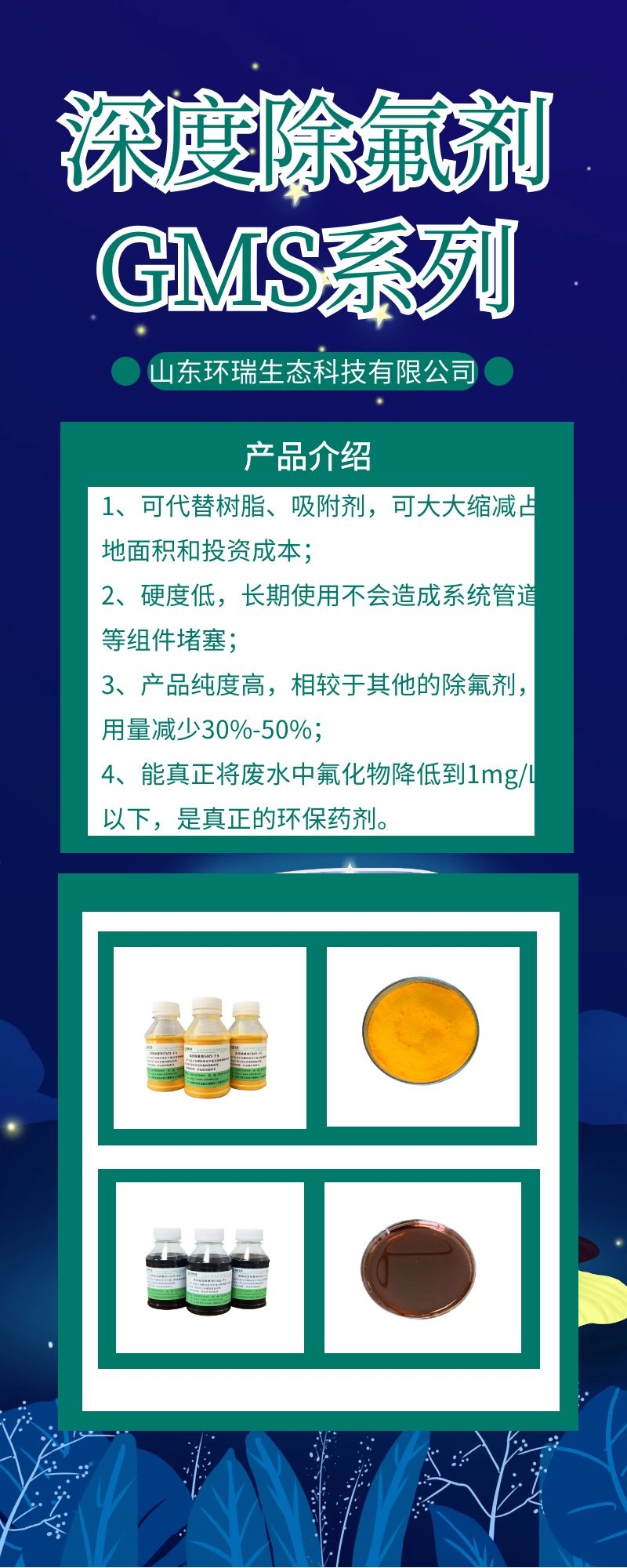 針對于目前市場上除氟技術的效果差、成本高等問題,山東環瑞生態自主研發了多種深度除氟劑和高效除氟劑,針對于不同的含氟廢水對癥下藥,力求客戶以最低的成本實現氟化物的高效去除,以做到溫泉含氟水達標排放。