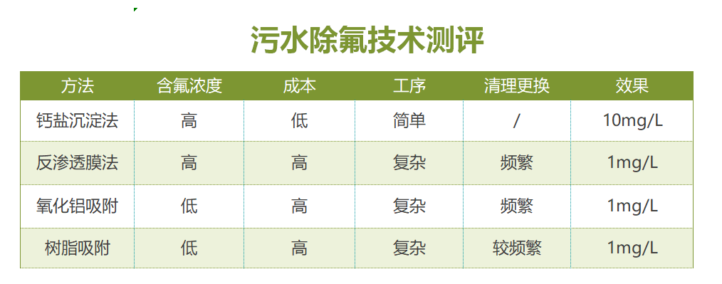 1. 鈣鹽沉淀法適用于中高濃度廢水(氟化物>20mg/L),成本較低,極限效果為8mg/L,一般都會超過10mg/L;僅適用于預(yù)處理,無法滿足深度處理;