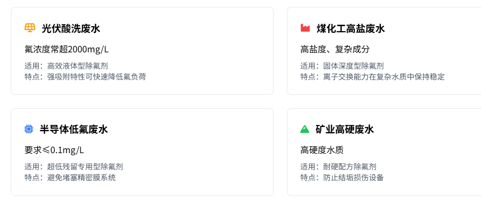 半導體低氟廢水(要求≤0.1mg/L)需超低殘留專用型,避免堵塞精密膜系統;